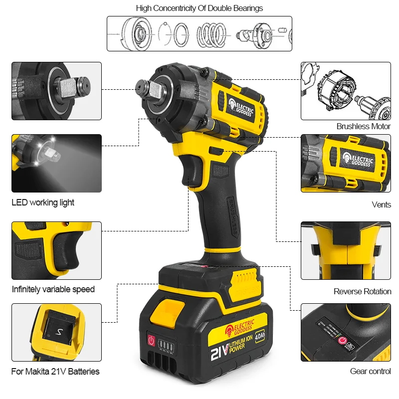 مفتاح ربط كهربائي لاسلكي 1/2 بوصة، بدون فرش، 21 فولت، متوافق مع بطاريات ماكيتا، مثالي لفك وربط المسامير والصواميل في الاستخدامات المنزلية.