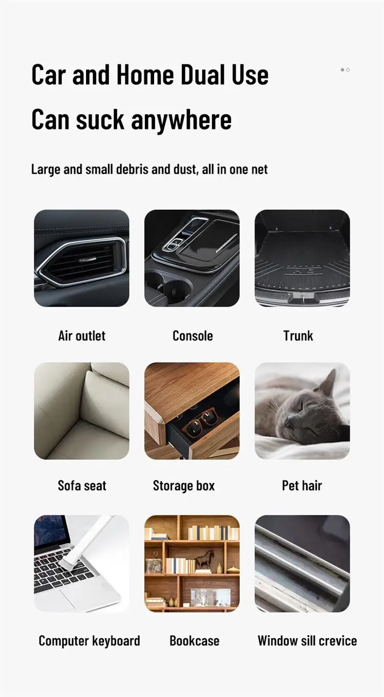 • تصميم ثنائي الغرض للاستخدام في السيارات والمنازل. : هذه المكنسة الكهربائية متعددة الاستخدامات ويمكن استخدامها في كل من السيارات والمنازل ، مما يجعلها أداة تنظيف مريحة.